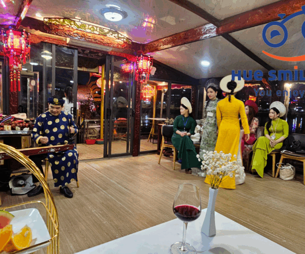 Tour du thuyền sông Hương nghe ca Huế ăn tối trên thuyền rồng sẽ đưa du khách đến không gian lãng mạn thoa mộng của đôi bờ Hương giang về đêm. Du khách sẽ được nghe lại các câu chuyện, sự tích qua lời ca của những nghệ nhân Huế – Ca Huế là một thể loại ca truyền thống đặc biệt của vùng này, mang đậm nét đặc trưng văn hóa Huế. Ca Huế thường được biểu diễn trong các dịp lễ hội và sự kiện quan trọng, góp phần làm nên sự đa dạng và phong phú của nền văn hóa Việt Nam.